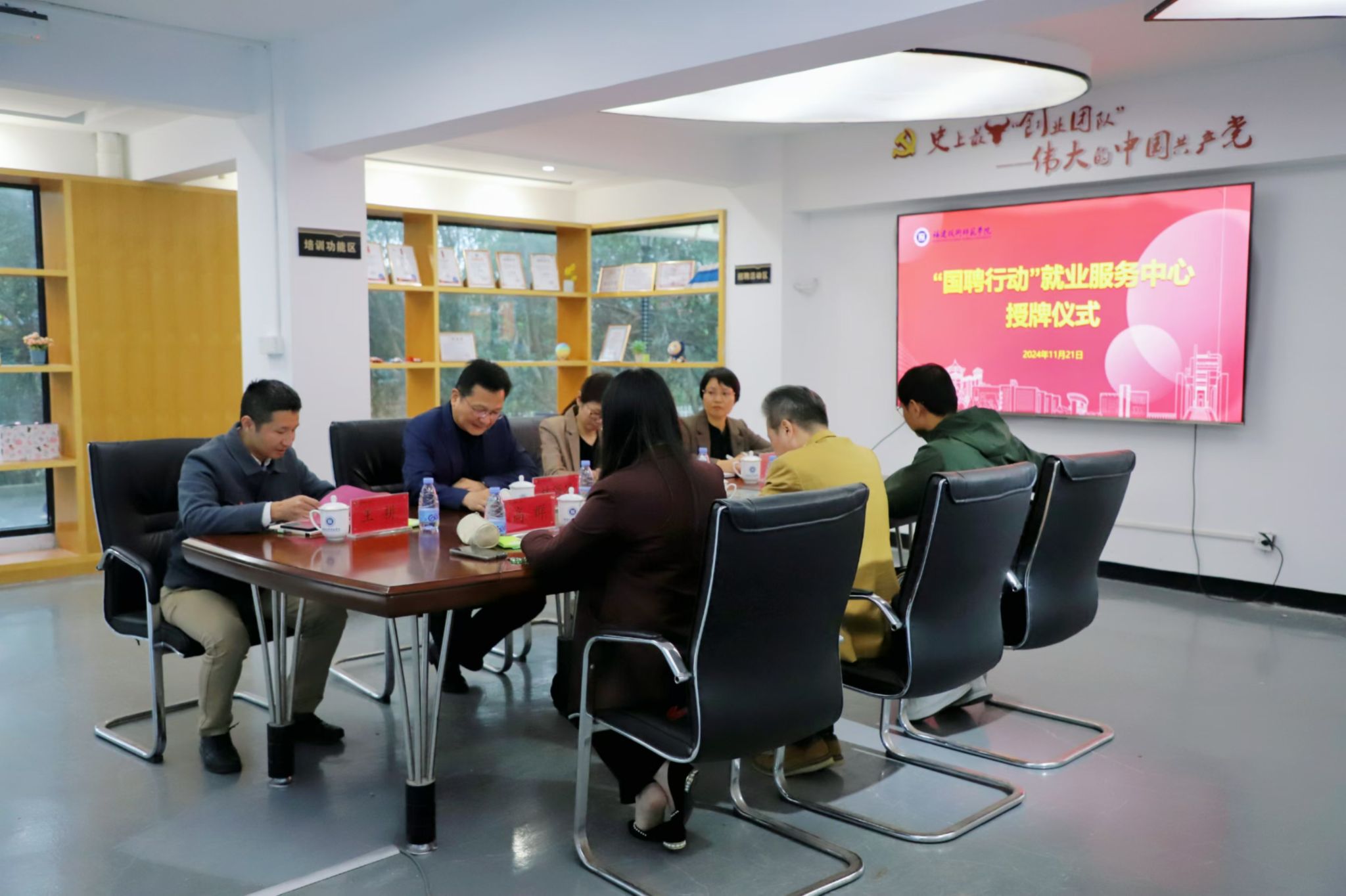 11月21日下午,“国聘行动”就业服务中心授牌仪式在我校大学生创新创业孵化基地会议室举行。福建省国源教育科技有限公司首席顾问周郑毅、总经理高群一行莅临我校授牌。校党委副书记林海峰,学生工作部负责人、校学生就业工作相关负责人出席本次仪式。